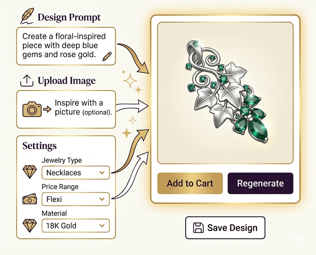 Tell our AI what you envision. Describe materials, styles, and the story behind your piece.